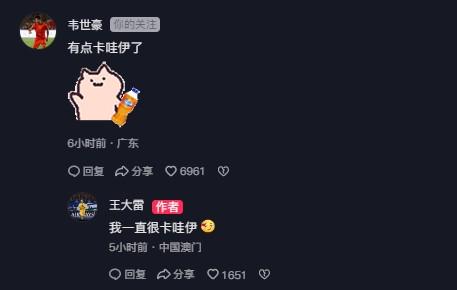 在这条动态的评论区,成都蓉城队球员韦世豪留言“调侃”说——“有点卡哇伊了。”随后,王大雷回复——“我一直很卡哇伊。”